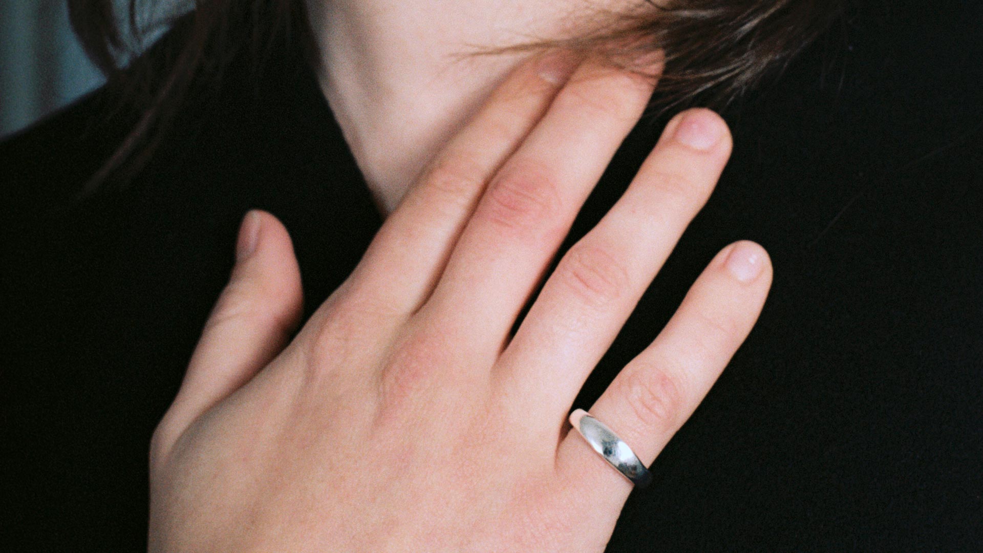 Anillo escultórico de plata de ley que reinterpreta la alianza clásica con un aire contemporáneo.
