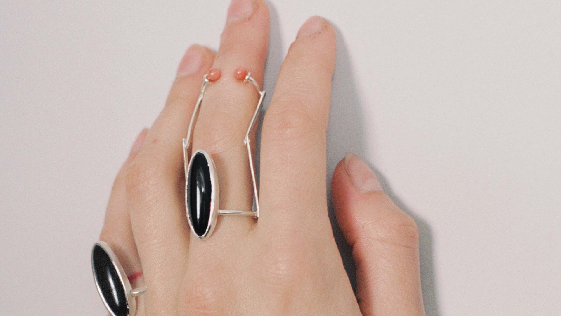 Anillo articulado en plata de ley. Un diseño que forma parte de nuestra identidad desde hace años. Incorpora un ónix oval y dos cuentas de coral vintage reutilizado. Diseñado para ofrecer comodidad y un uso natural, su estructura flexible acompaña el movimiento del dedo.