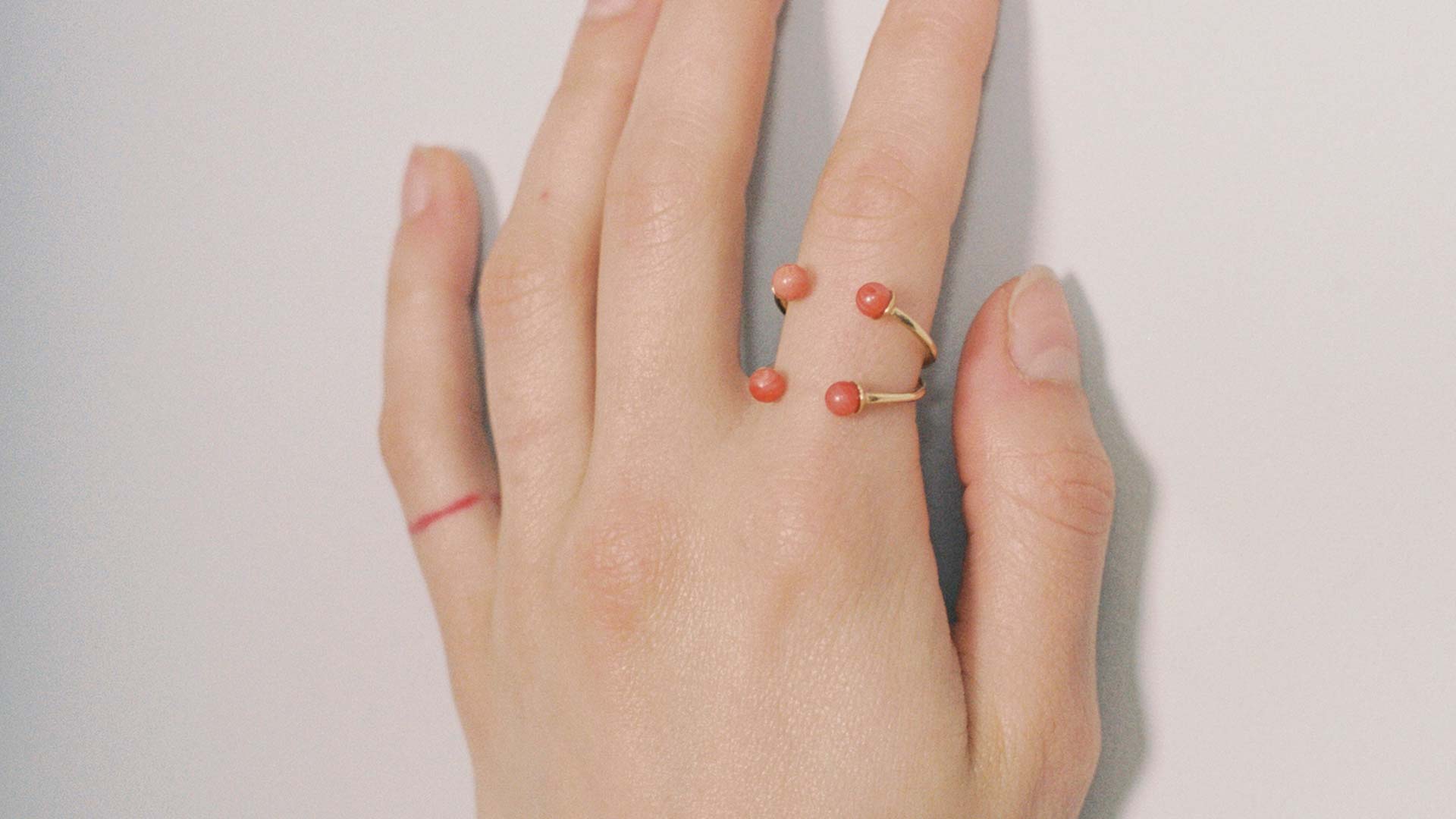 Anillo de edición limitada en plata de ley bañada en oro, con coral vintage reutilizado en cada extremo. Al llevarlo, recuerda a un piercing, aportando un toque inesperado y orgánico. Ajustable para un uso cómodo. La talla S/M corresponde a tallas españolas 9–12 y la M/L a las 12–16.