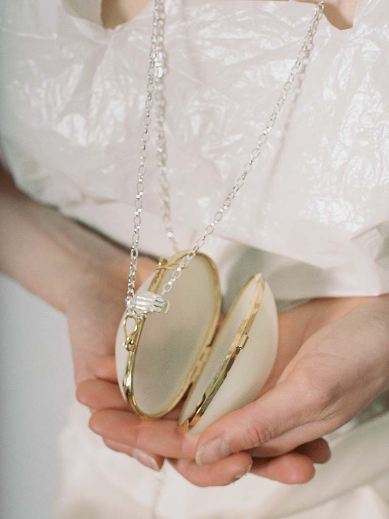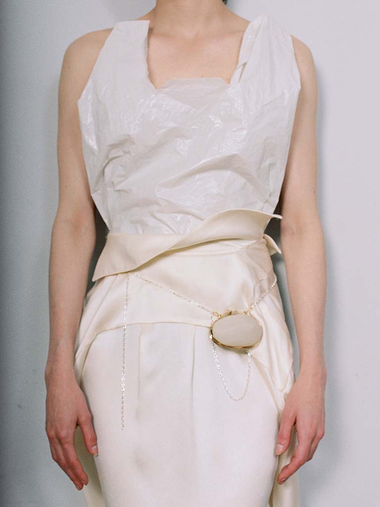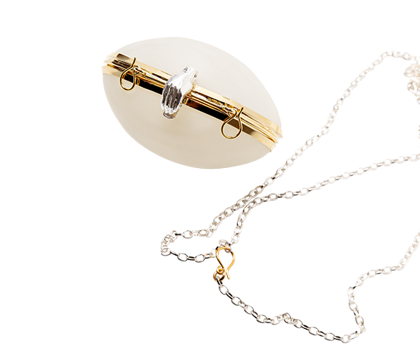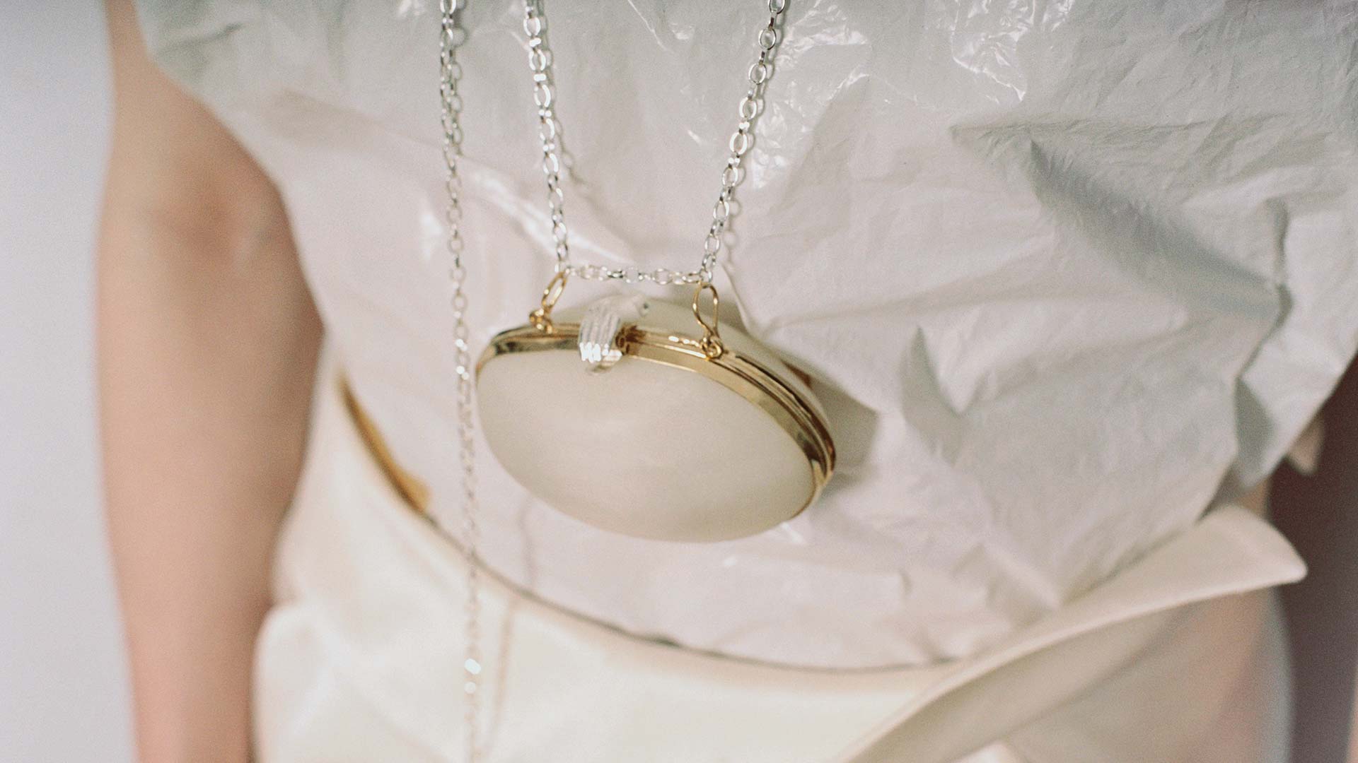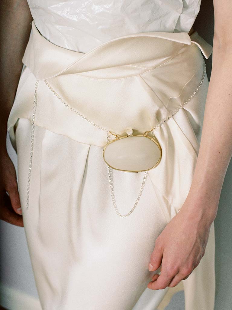 Monedero impreso en 3D realizado con biomaterial de concha de vieira, inspirado en los tradicionales bolsos limosneros. Concebido como un objeto contemporáneo, reinterpreta un accesorio histórico a través de la investigación de materiales y la forma.