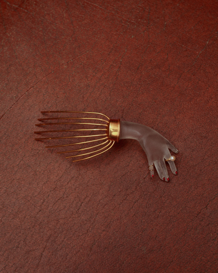 Peineta de plata chapada en oro con una mano de resina. Las uñas van en plata esmaltada a fuego y el anillo lleva una perla de agua dulce.