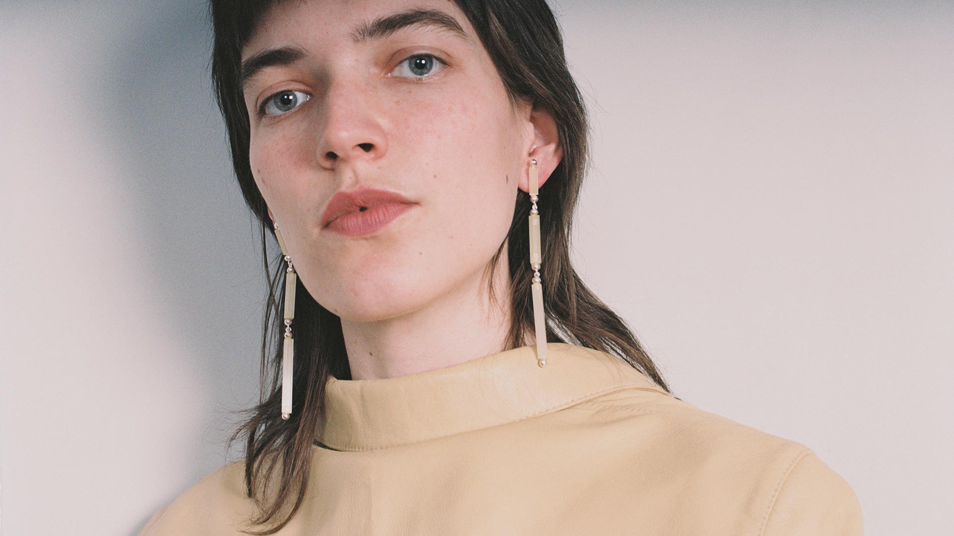 Pendientes de plata engastados con cristal satinado en tono amarillo pálido. Se venden como pareja y tienen un largo de 10cm.
