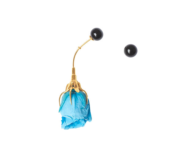 Gold plated sterling silver earring set with a preserved natural rose. It comes with an extra onyx stud earring for the other ear. Please note the rose is a real rose that has been preserved. Keep it away from water and store it in the original box when not wearing it so it will look fresh for many years.